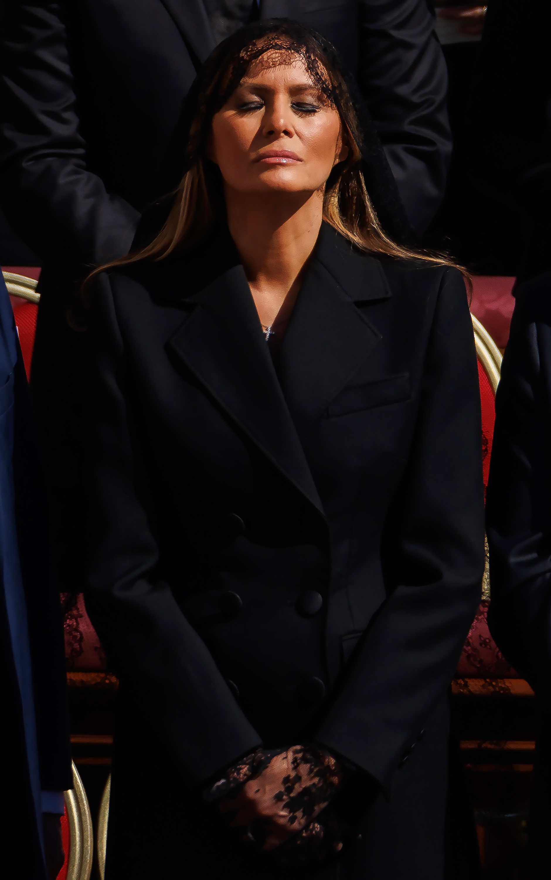 Mrs. Trump appropriately wore all black at St. Peter’s Basilica in a double-breasted Dolce & Gabbana wool coat featuring black satin buttons. The look was paired with a veil in silk georgette with Chantilly lace, along with matching Chantilly lace gloves, also by Dolce & Gabbana.