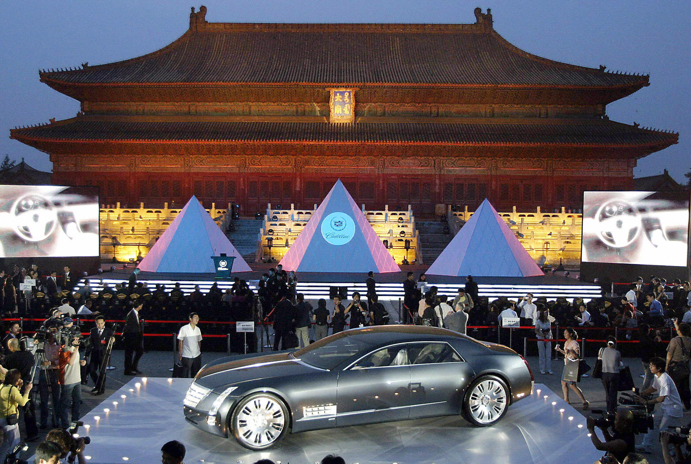 A luxury Cadillac XLR from U.S. auto giant General Motors is on display at a ceremony in the Forbidden City in Beijing, China, on June 7 2004, following General Motors’ announcement of an ambitious expansion in China. (STR/AFP via Getty Images)