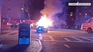“It was like a riot and then we saw someone get arrested and we look to our right and there’s this cop car on fire,” said Simran Nalhatra, who lives nearby.