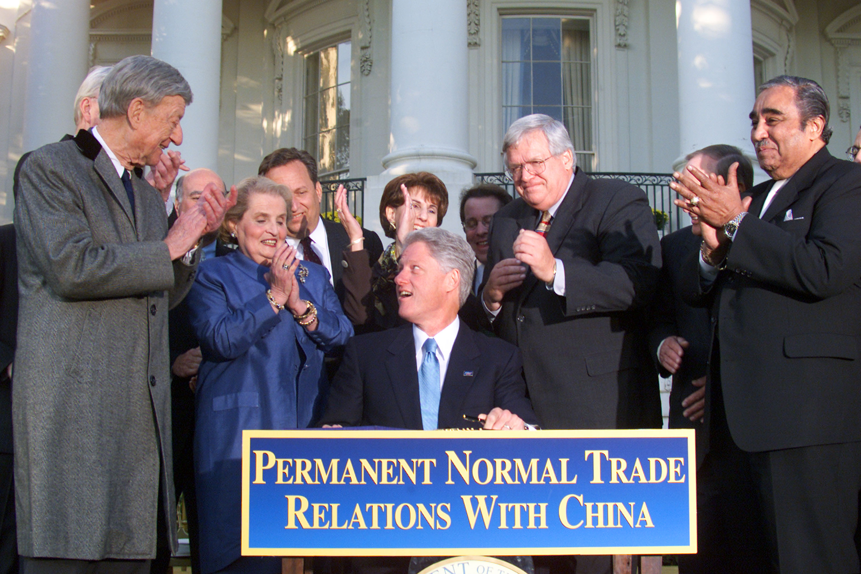 President Bill Clinton is surrounded by Secretary of State Madeleine Albright, Treasury Secretary Lawrence Summers, Trade Representative Charlene Barshefsky, House Speaker Dennis Hastert, and members of Congress as he signs a Permanent Normal Trade Relations for China Bill on October 10, 2000, in Washington, DC. (Mark Wilson/Newsmakers via Getty Images)