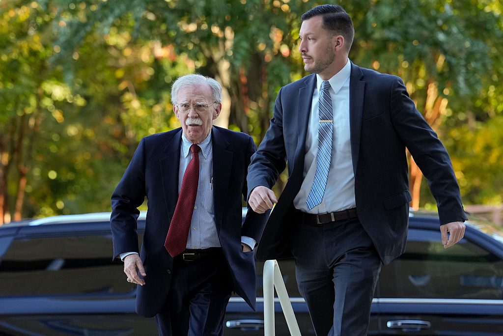 John Bolton, former US national security adviser, left, arrives at the US district courthouse in Greenbelt, Maryland, US, on Friday, Oct. 17, 2025. (Eric Lee/Bloomberg via Getty Images)