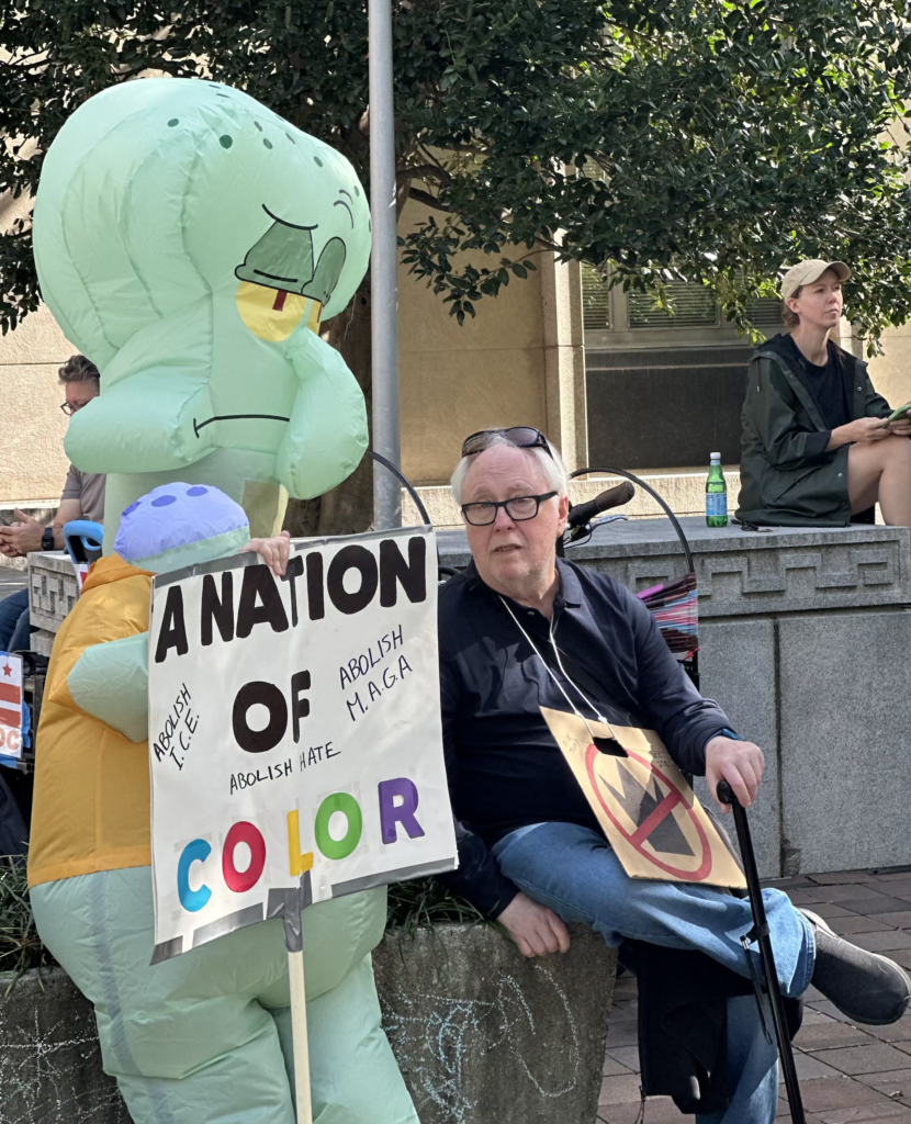 Leftist activist on his way to attend the “No Kings” protest in Washington, DC, on Saturday, October 18, 2025. (Matthew Perdie / Breitbart News)