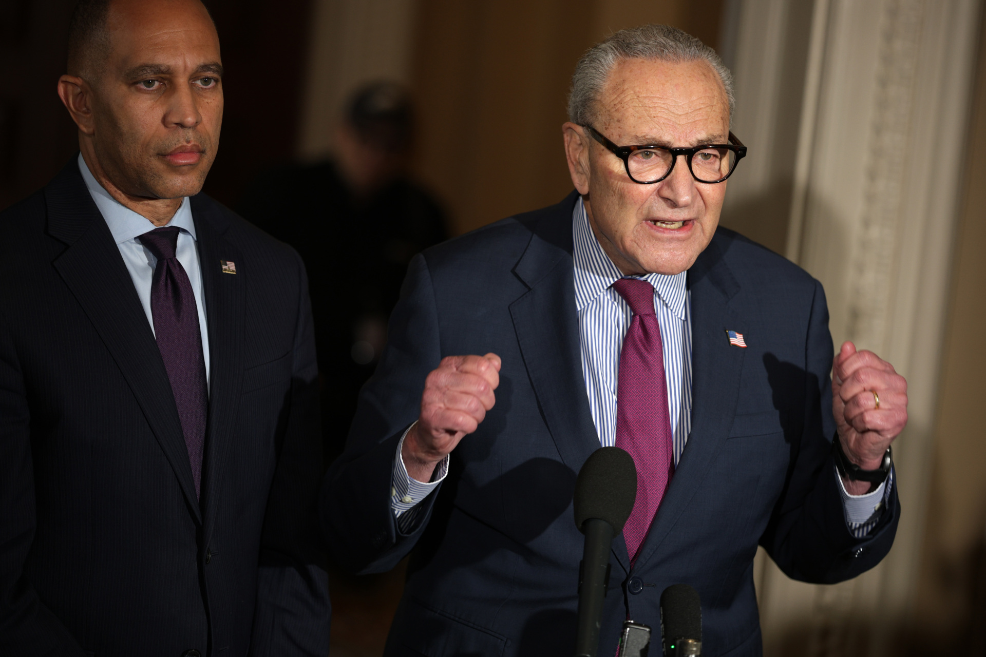 Senate Minority Leader Sen. Chuck Schumer (D-NY), right, and House Minority Leader Rep. Hakeem Jeffries (D-NY) speak at a news conference about the government shutdown at the U.S. Capitol on October 16, 2025, in Washington, DC. (Alex Wong/Getty Images)