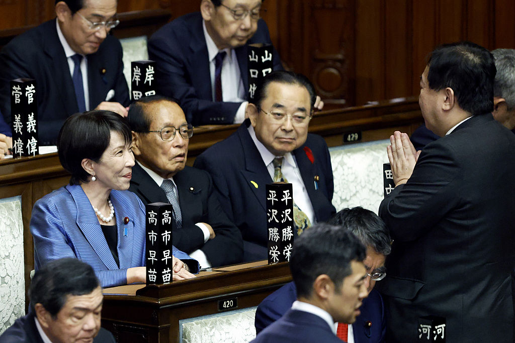Sanae Takaichi, president of the Liberal Democratic Party, left, attends an extraordinary session at the lower house of parliament in Tokyo, Japan, on Tuesday, Oct. 21, 2025. Takaichi won the parliamentary vote to become Japan’s prime minister, making her the first woman to clinch the nation’s top leadership job. (Kiyoshi Ota/Bloomberg via Getty Images)