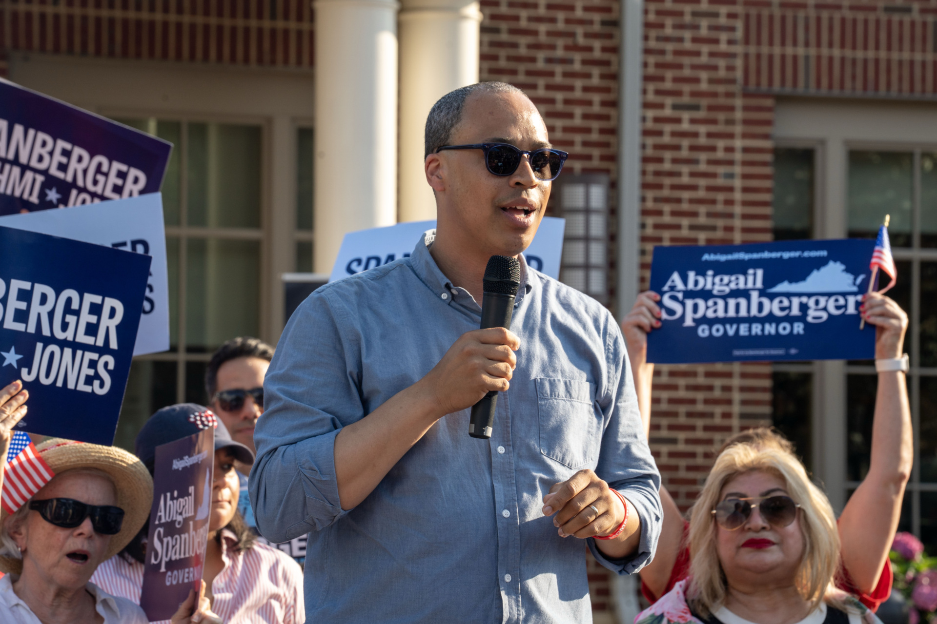 Virginia Democrat attorney general candidate Jay Jones speaks to an audience at a bus tour stop for Democrat gubernatorial candidate Abigail Spanberger in Fairfax, Virginia, on June 26, 2025. (Maxine Wallace/The Washington Post via Getty Images)