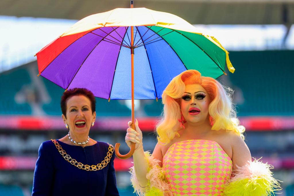 File/Sydney Lord Mayor Clover Moore and performer Hannah Conda look on during the launch of the 2022 Sydney Gay and Lesbian Mardi Gras at Sydney Cricket Ground on October 14, 2021 in Sydney, Australia. (Mark Evans/Getty Images)
