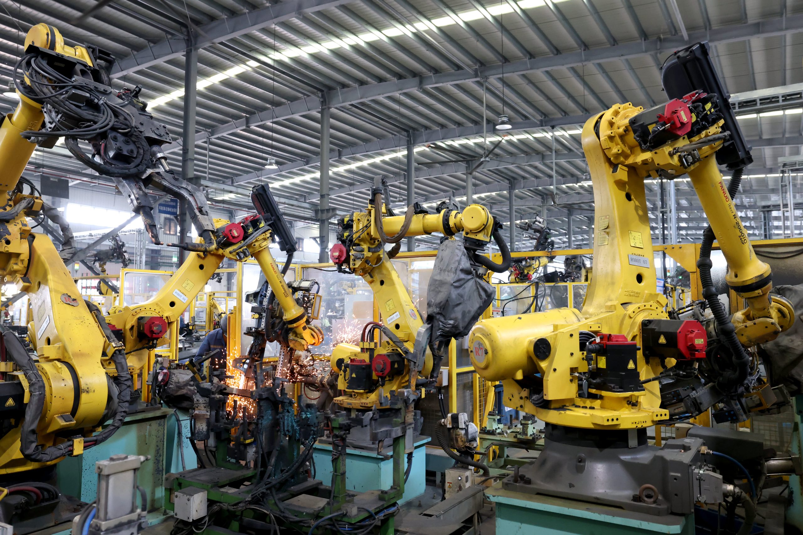Robots manufacture auto parts at a factory in Ningde, China, on Oct. 17, 2024.