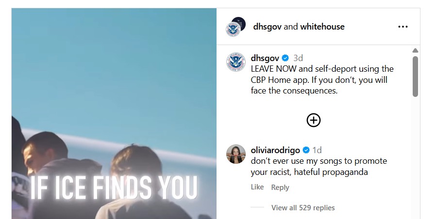 Rodrigo showed up in the comments of the post, writing: “don’t ever use my songs to promote your racist, hateful propaganda.”