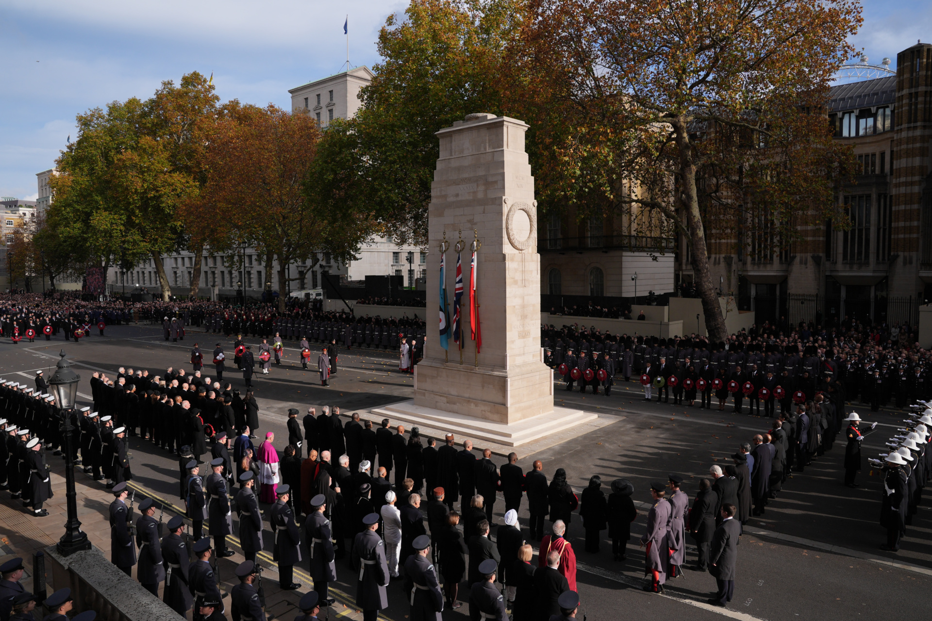 As Parliament’s Big Ben bell tolled 11 a.m., the crowd fell still for two minutes of silence, broken by a single artillery blast and Royal Marines buglers sounding “The Last Post.”