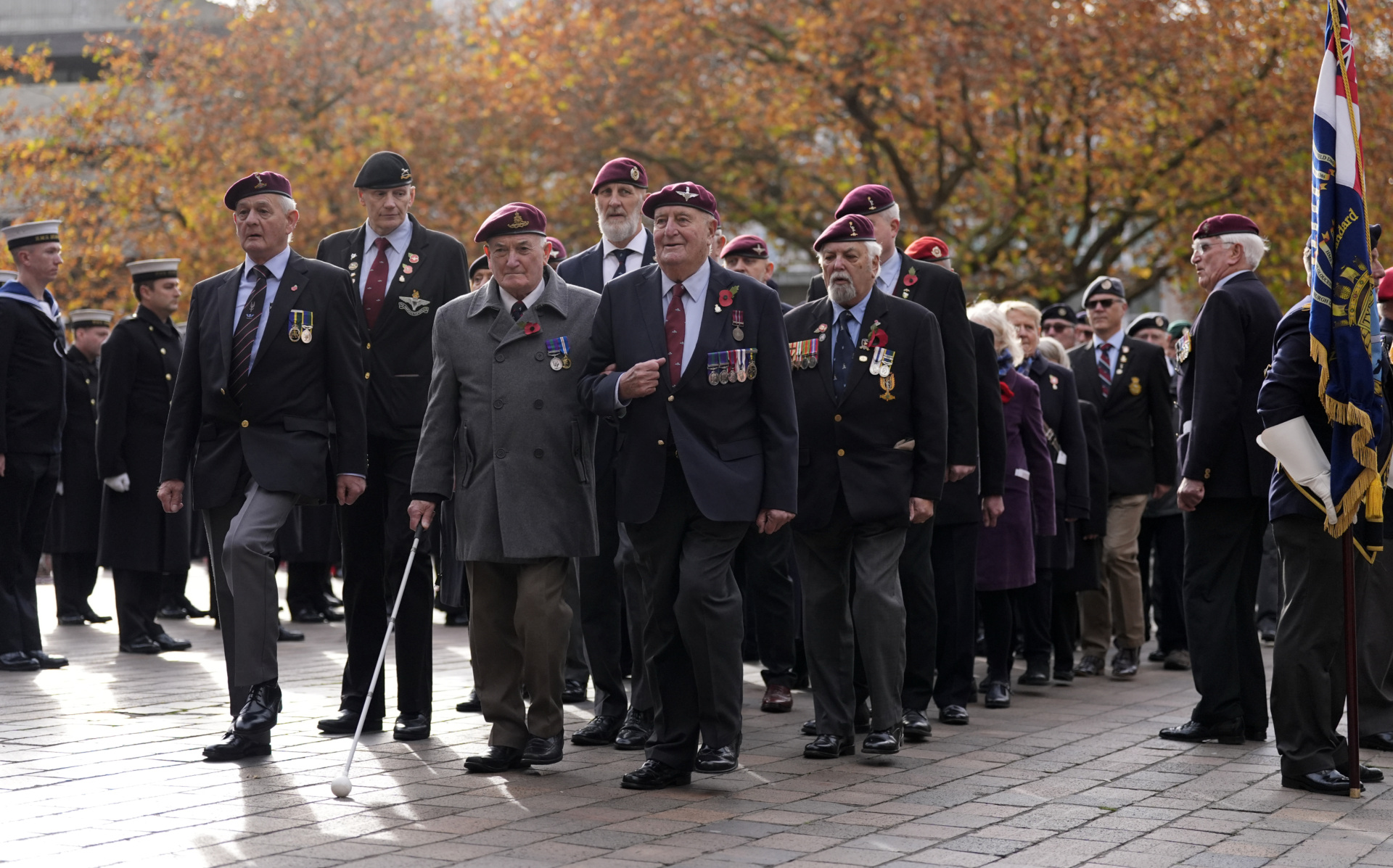 Veterans make their way into Guildhall Square in Portsmouth ahead of a Remembrance Sunday service. Picture date: Sunday November 9, 2025. (Photo by Andrew Matthews/PA Images via Getty Images)