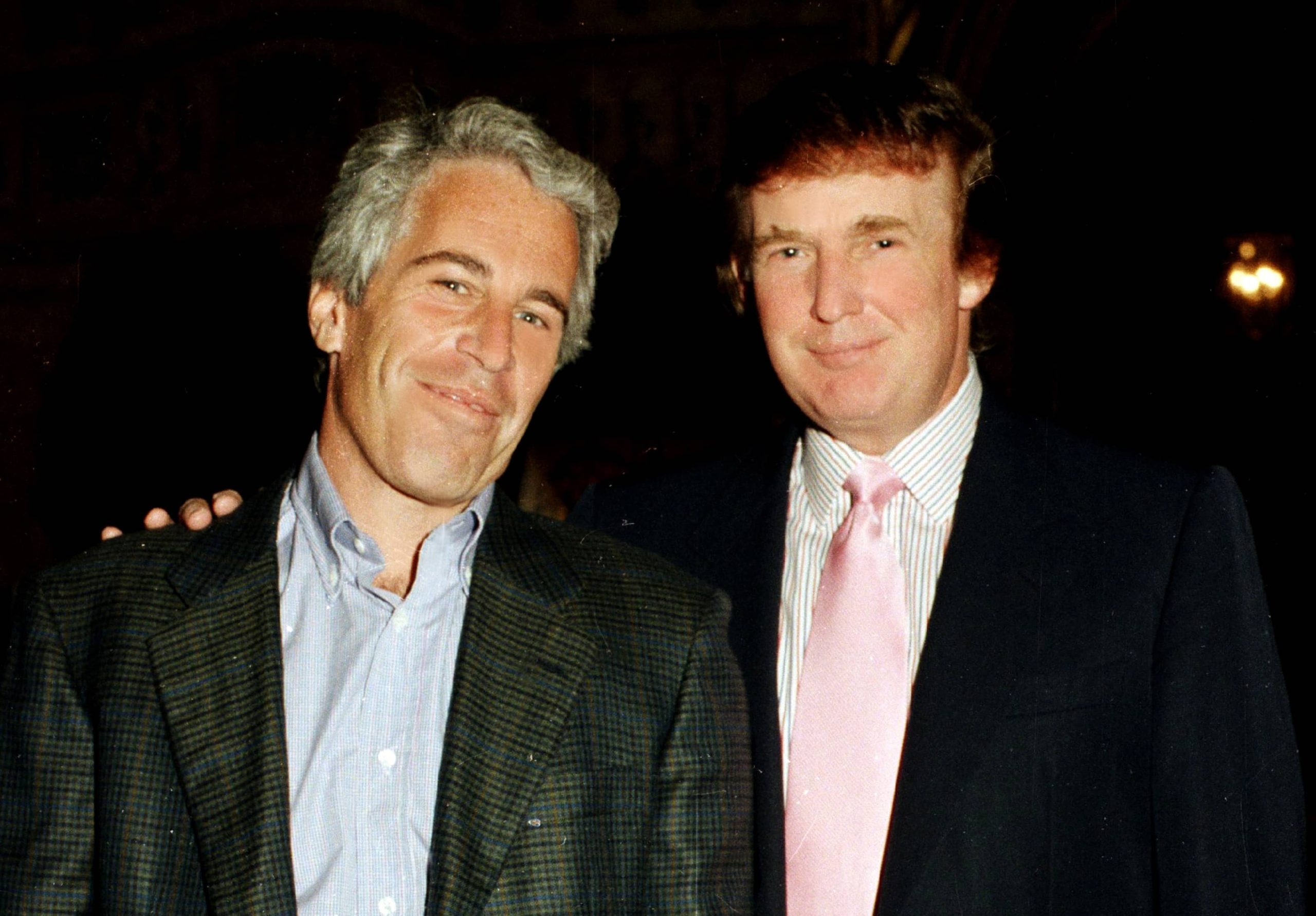 In a 1997 photo, Jeffrey Epstein, left, and Donald Trump pose together at the Mar-a-Lago estate in Palm Beach, Florida.