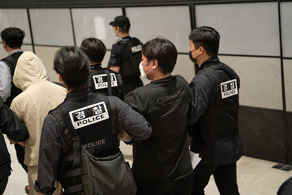 INCHEON, SOUTH KOREA – OCTOBER 18: Sixty-four South Koreans who had been detained by Cambodian immigration authorities arrive at Incheon International Airport on a chartered flight in Incheon, South Korea, on October 18, 2025.