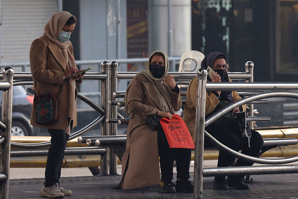 Women wearing face masks to protect themselves from air pollution wait for transport in Tehran on November 29, 2025. (ATTA KENARE / AFP via Getty)