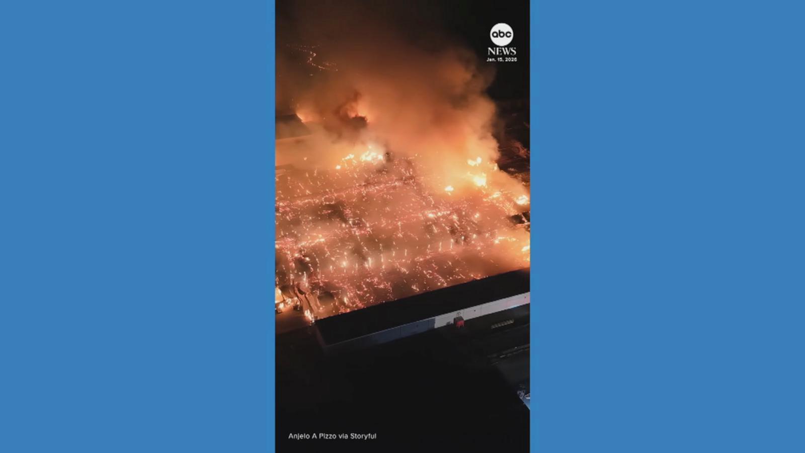 A massive fire erupted at a Virginia plant on Thursday night, spreading to wooded areas nearby.