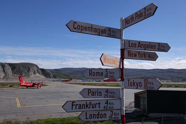 KANGERLUSSUAQ, GREENLAND – JULY 09: Passenger planes for local flights of Air Greenland stand on the tarmac at the airport as signs show the flight times to various global destinations on July 09, 2024 in Kangerlussuaq, Greenland. (Photo by Sean Gallup/Getty Images)