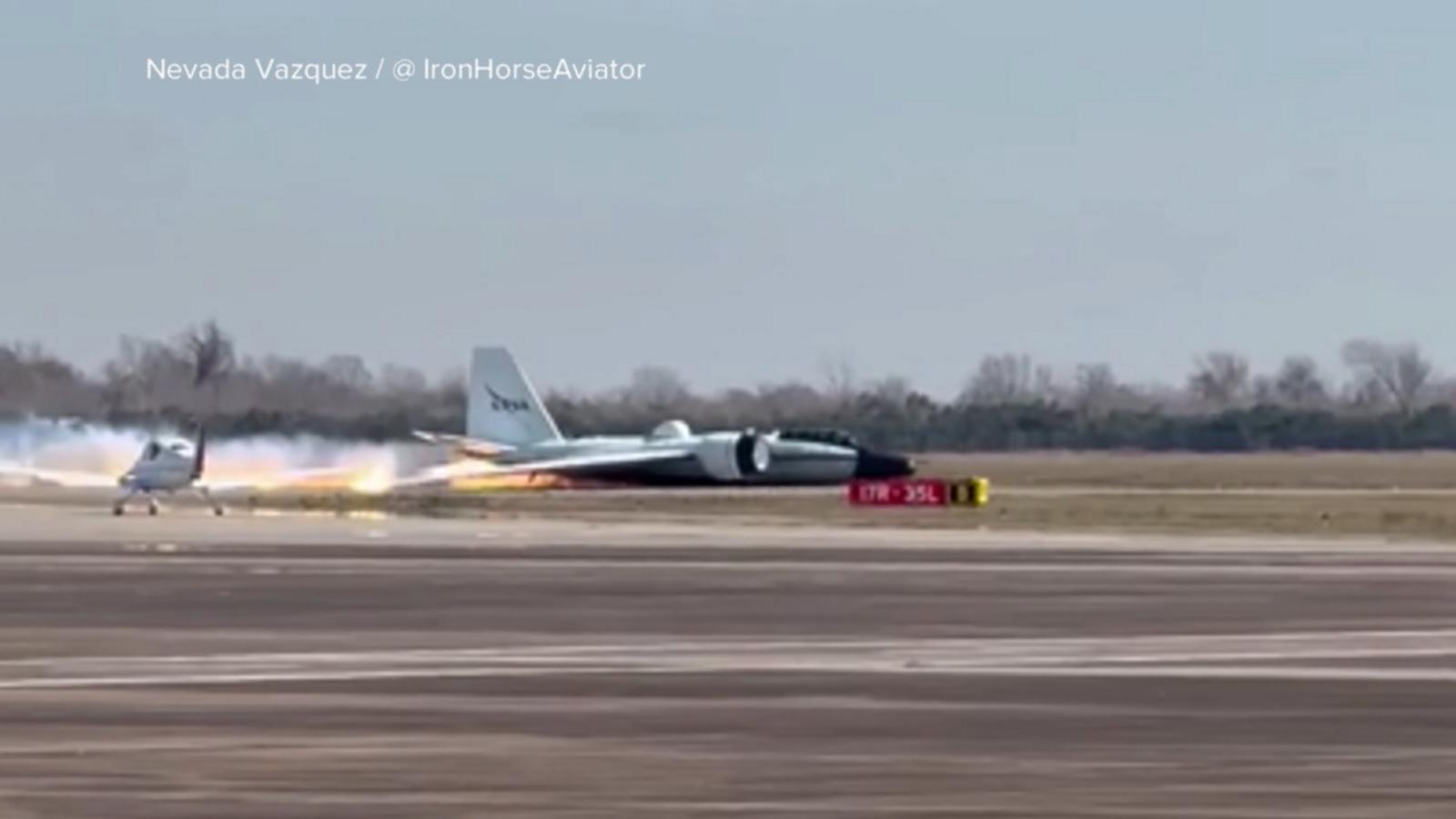 The jet’s landing gear appears to fail before the aircraft skids on its belly across the runway with flames trailing behind it.