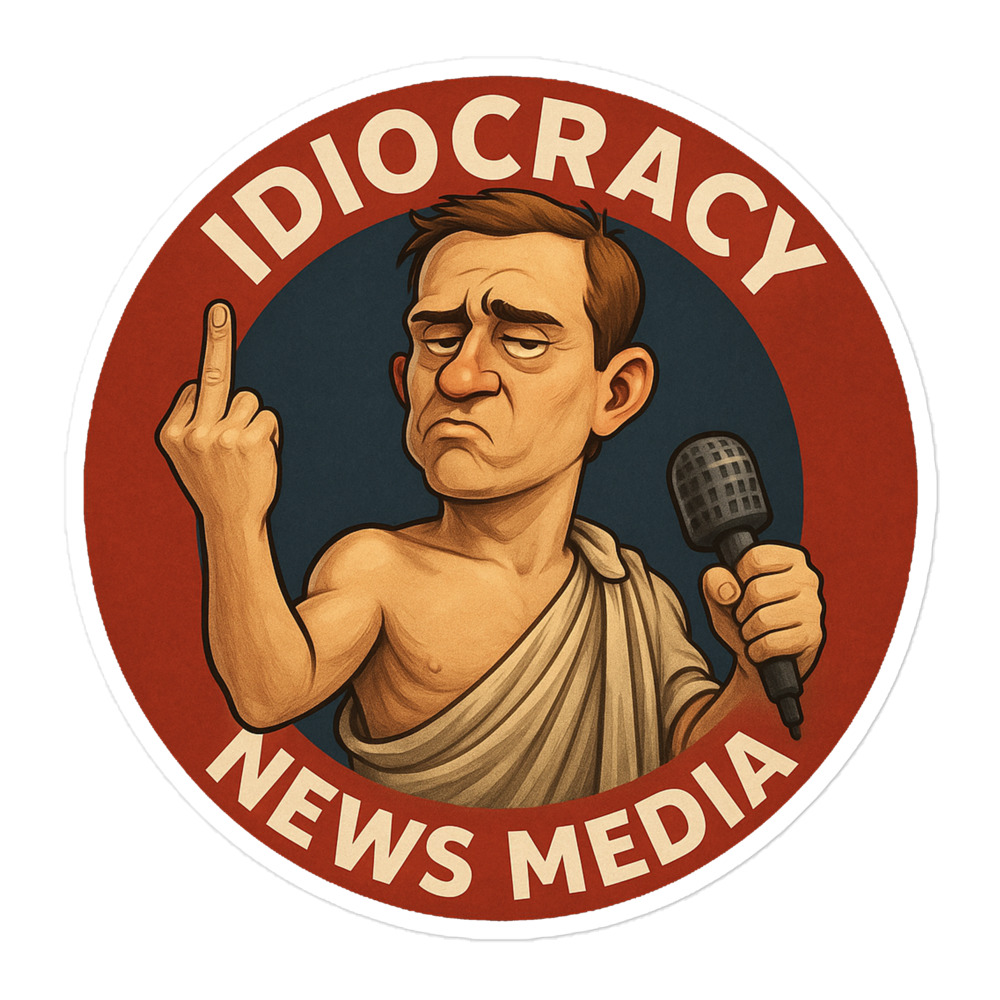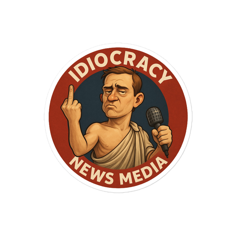 The official Idiocracy News Media logo printed on high-opacity durable vinyl designed for clean, bubble-free application. Perfect for laptops, water bottles, tool cases, road cases, notebooks, or anywhere that needs a little cultural commentary.